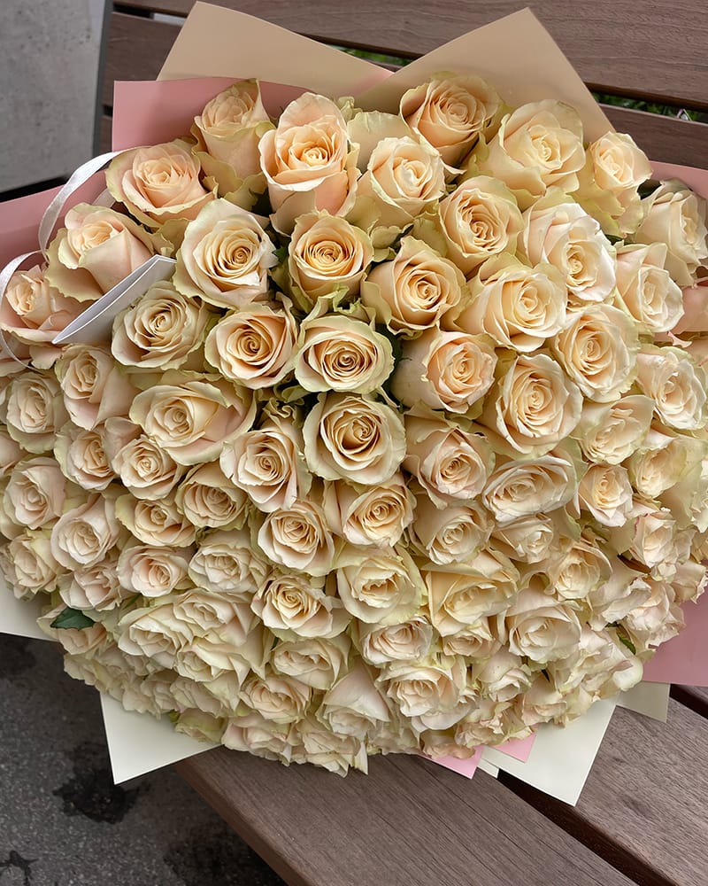 101 krēmkrāsas roze, pušķī izmantota ziedu šķirne Charmant, tā ir īpaši izturīga un ilgi priecēs ziedu saņēmēju.