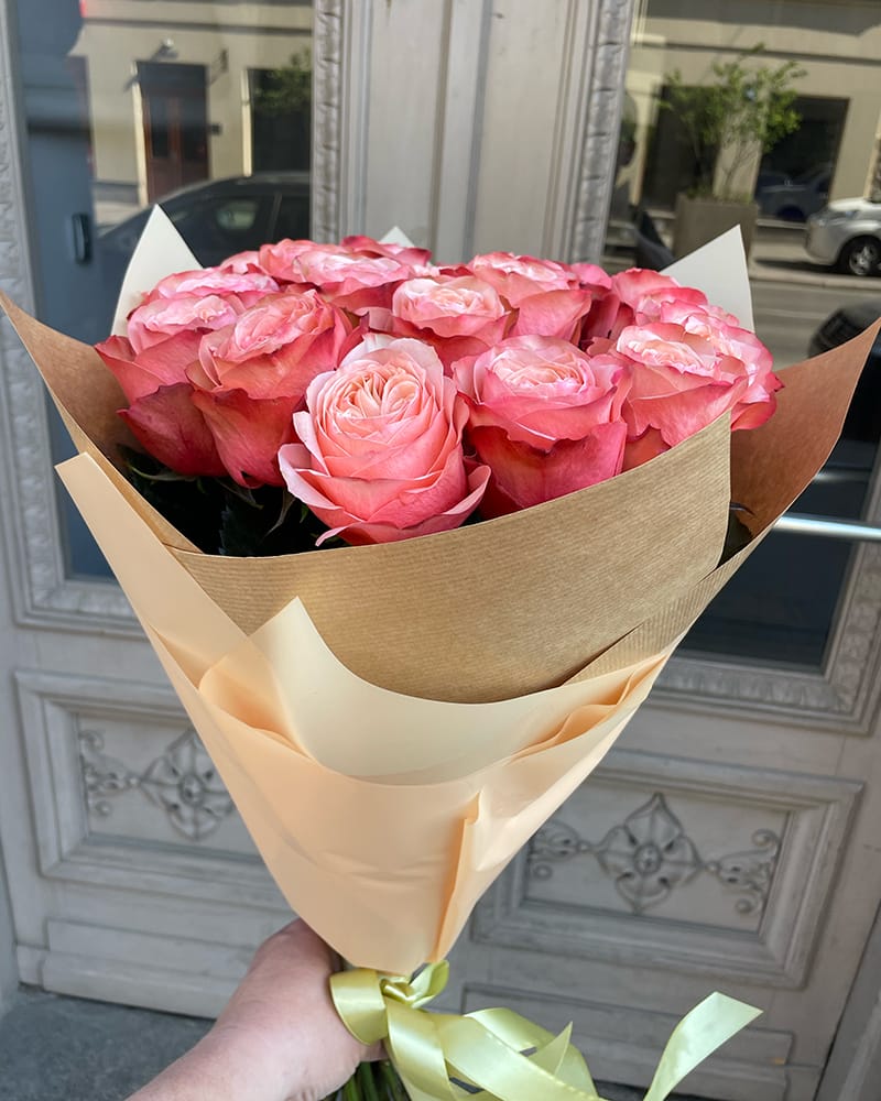 Skaistas persiku krāsas rozes dekoratīvajā iepakojumā, pušķī iespējams mainīt ziedu skaitu atbilstoši Jūsu vēlmēm.