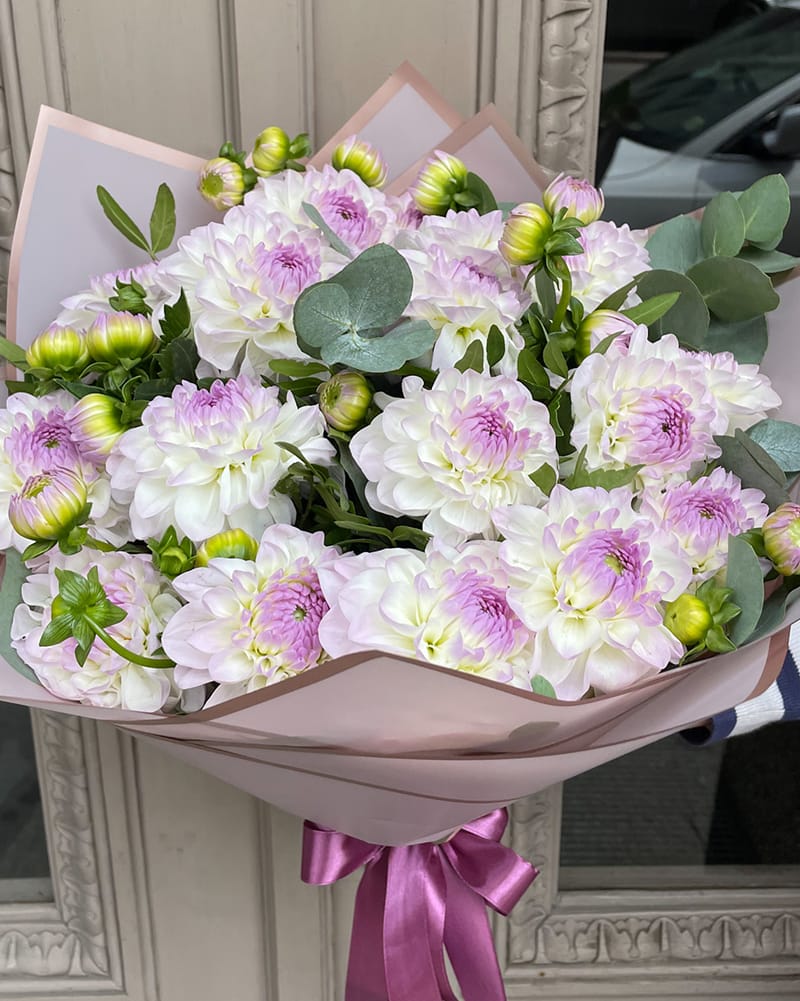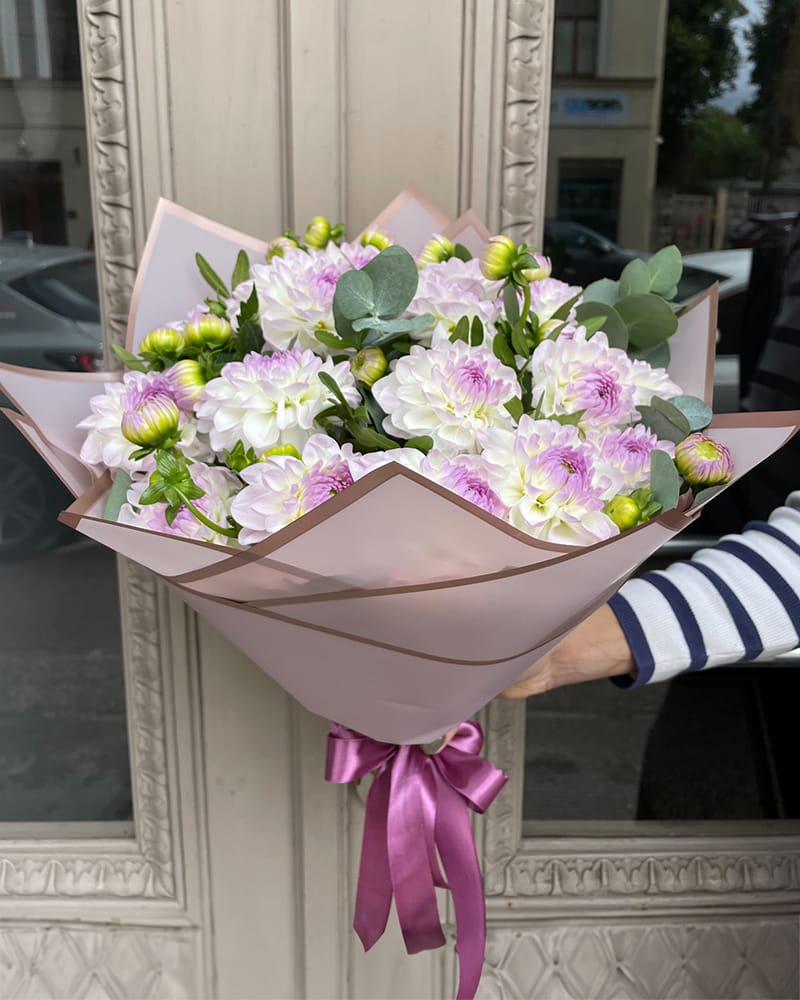 Sākums » Ziedu katalogs » Visi ziedi » Dāliju pušķis dekoratīvā iepakojumā