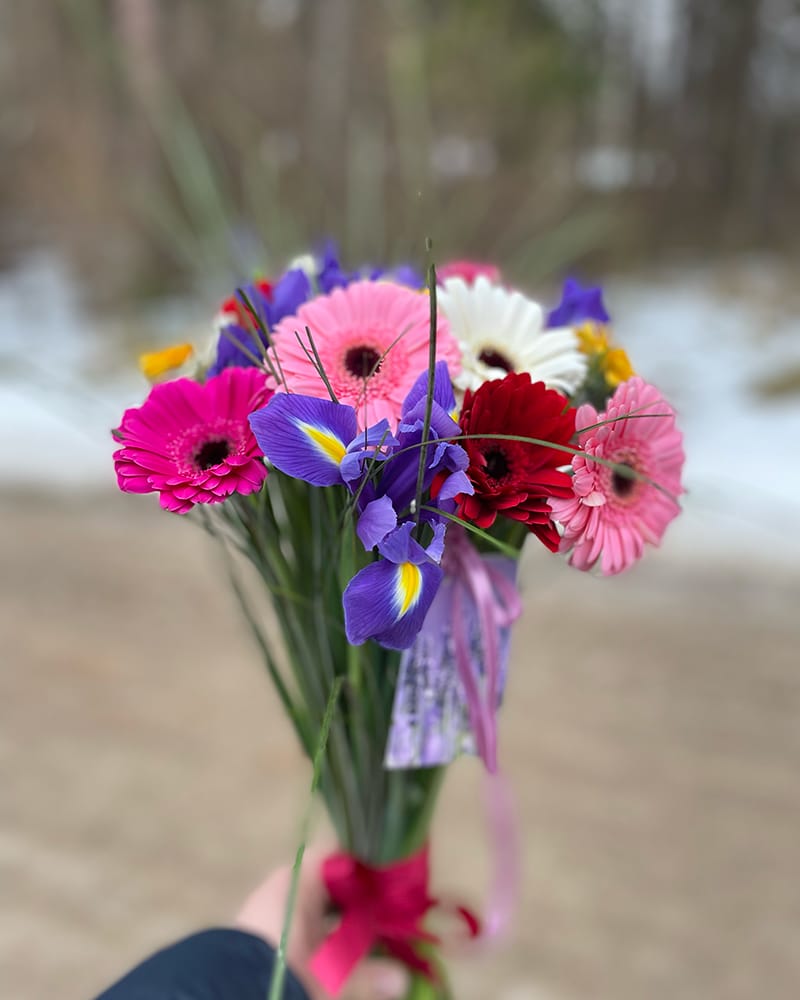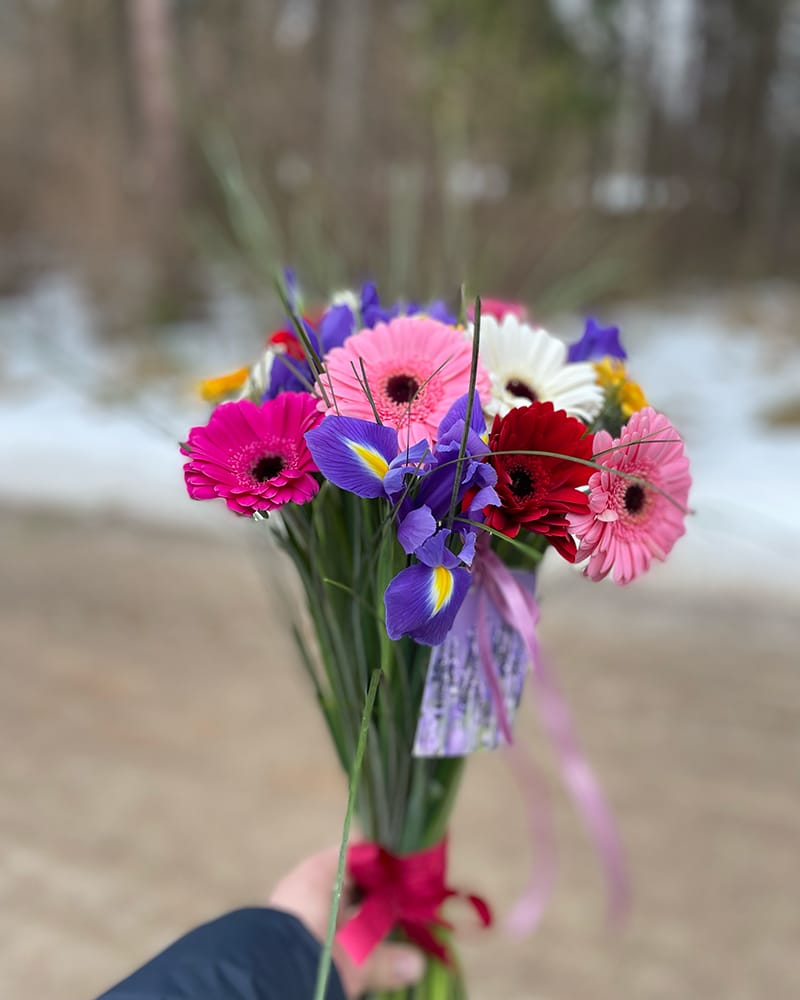 Dažādu krāsu gerberas ar ziliem īrisiemDažādu krāsu gerberas ar ziliem īrisiem