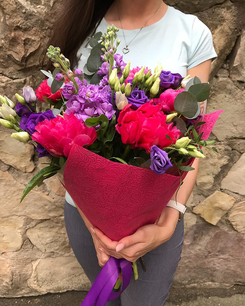 Sākums » Ziedu katalogs » Peoniju Pušķi » Peoniju, lizanšu, un lefkoju pušķis ar eilkaliptu