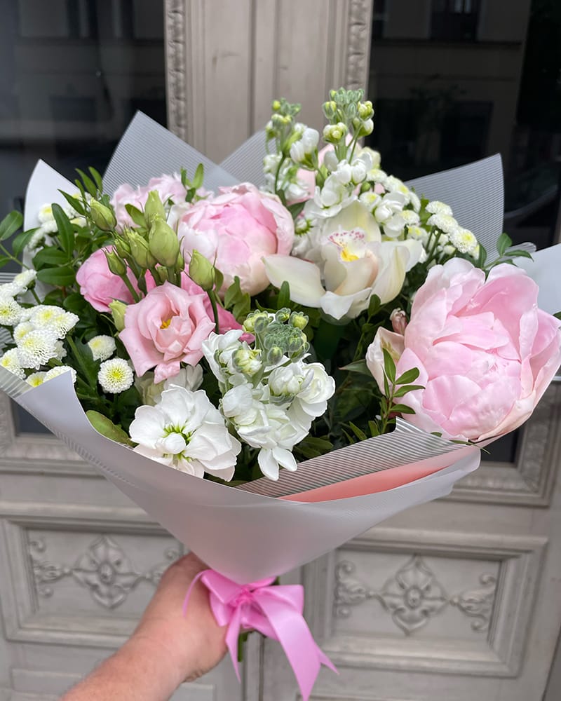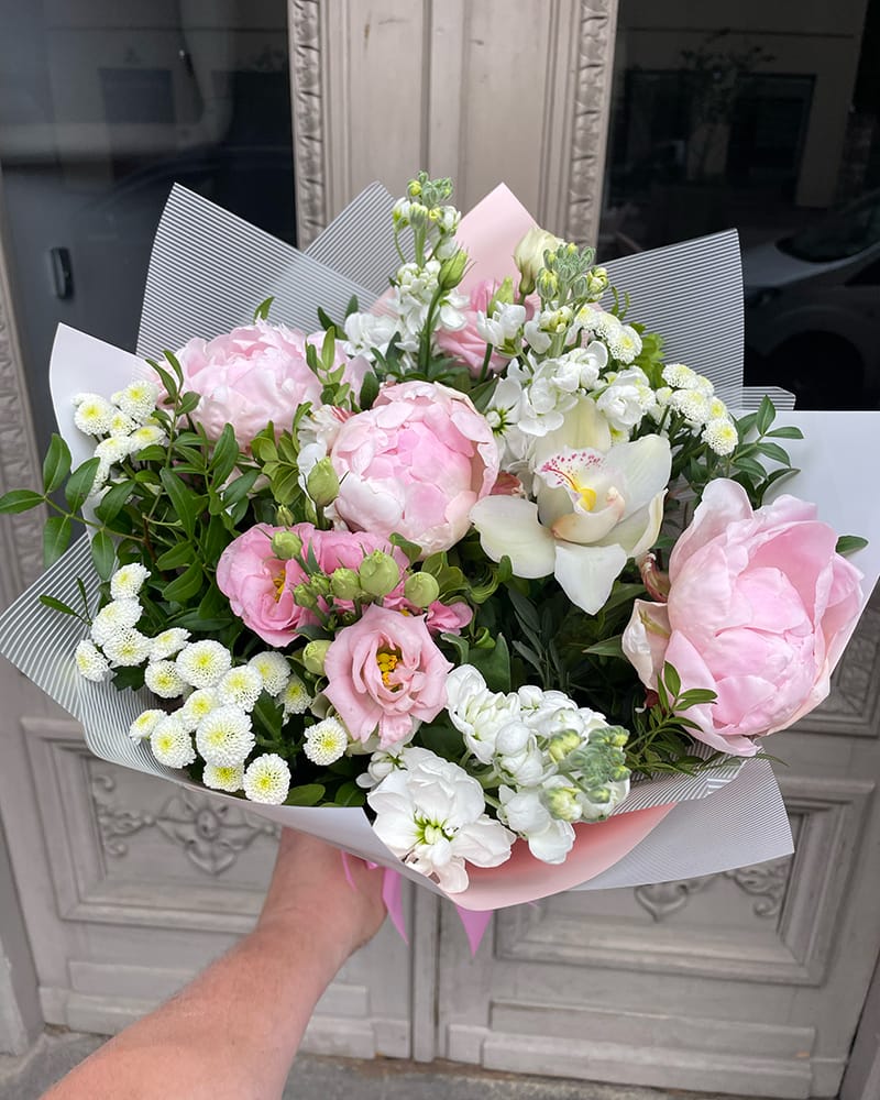Pušķis sastāv no: 3 peonijām, 3 lefkojām, 3 santini krizantēmām, 2 lizantēm, 1 orhidejas zieda, 5 pistācijas zari.