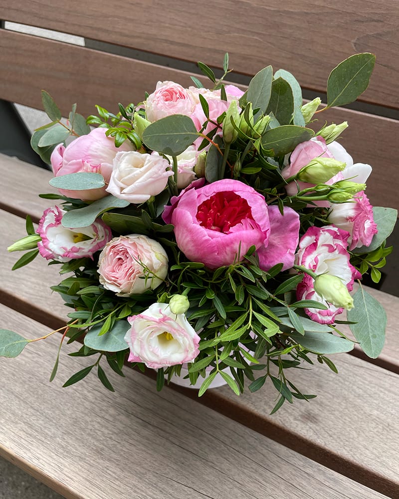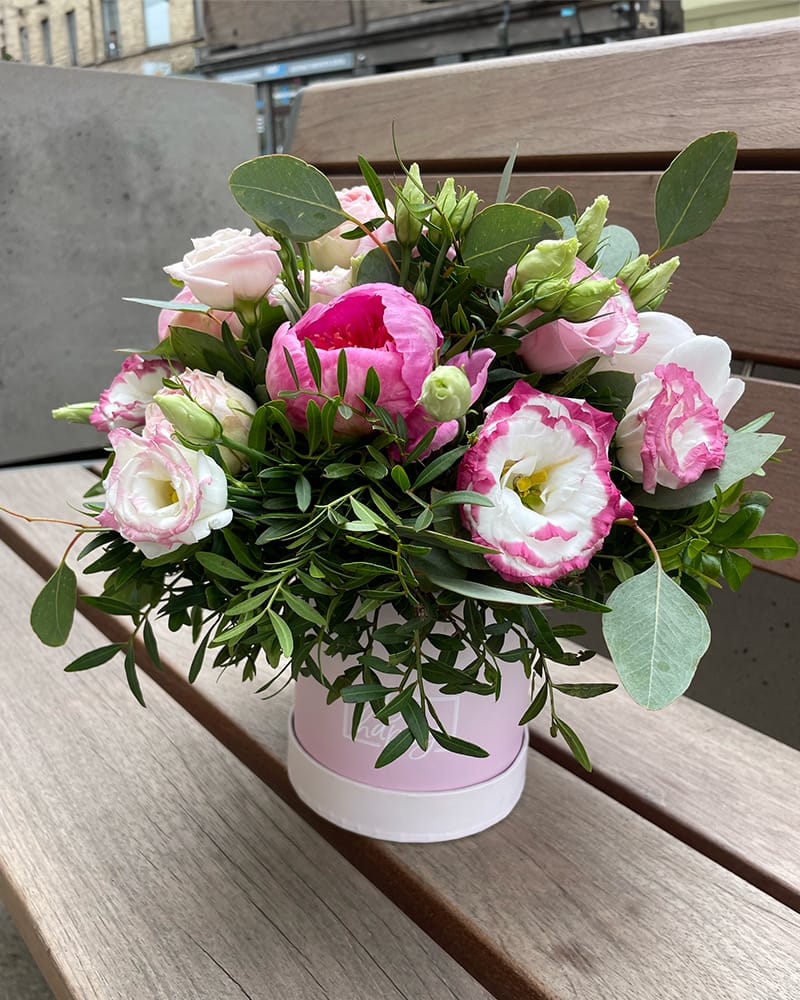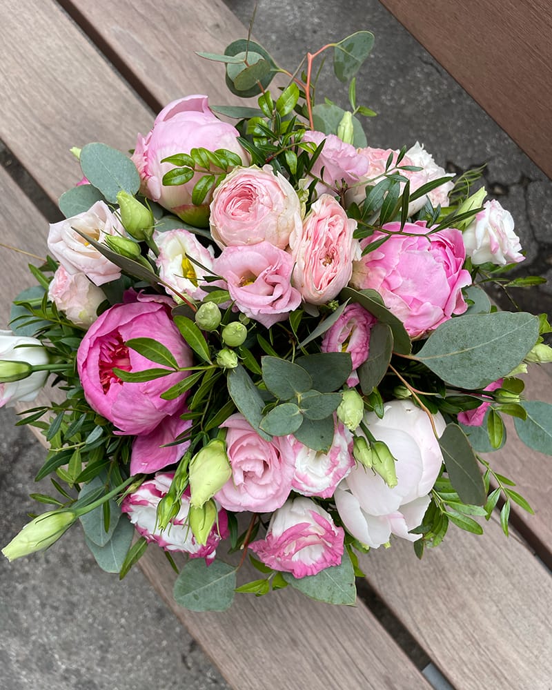 Ziedu kastītes sastāvs: 5 peonijas, 1 lizante, 1 krūmroze, 0.2 eikalipts, 5 zari pistācija.