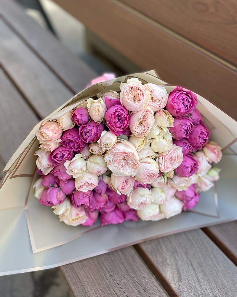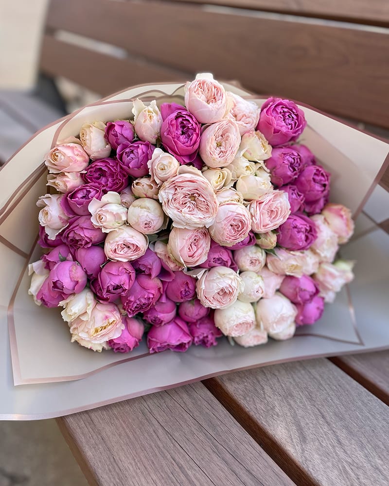 Pušķa sastāvs: 9 krūmrozes, dekoratīvais iepakojums