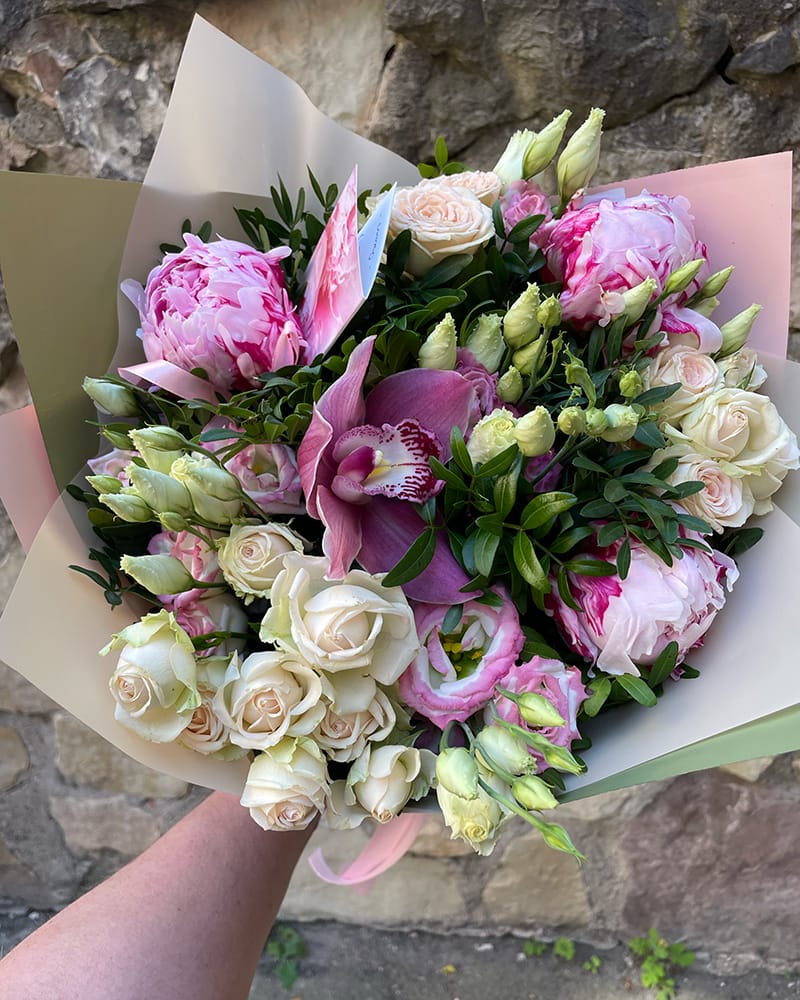 Pušķis peonijas, rozes, lizantesPušķis peonijas, krūmrozes, lizantes
