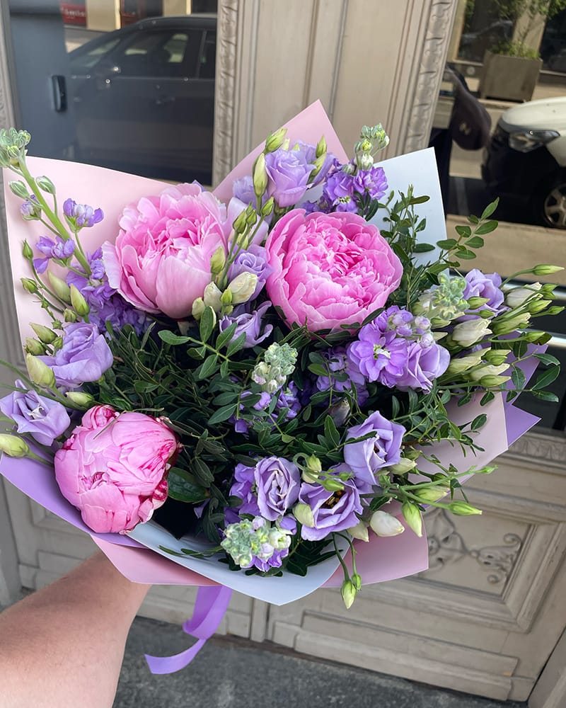 Pušķis peonijas, lizantes lefkojasPušķis peonijas, lizantes lefkojas