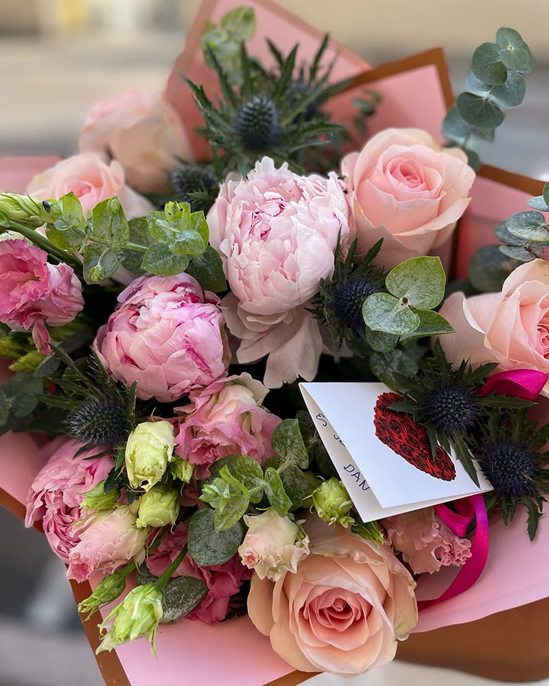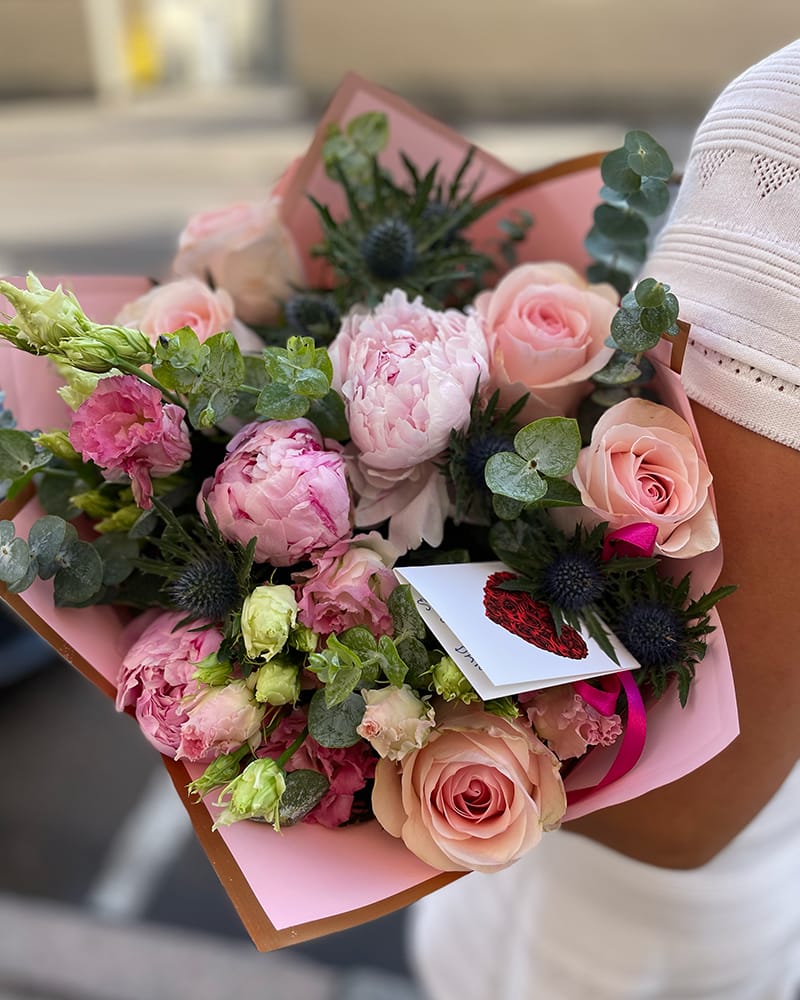 Sākums » Ziedu katalogs » Bez kategorijas » Pušķis peonijas, rozes, lizantes u.c
