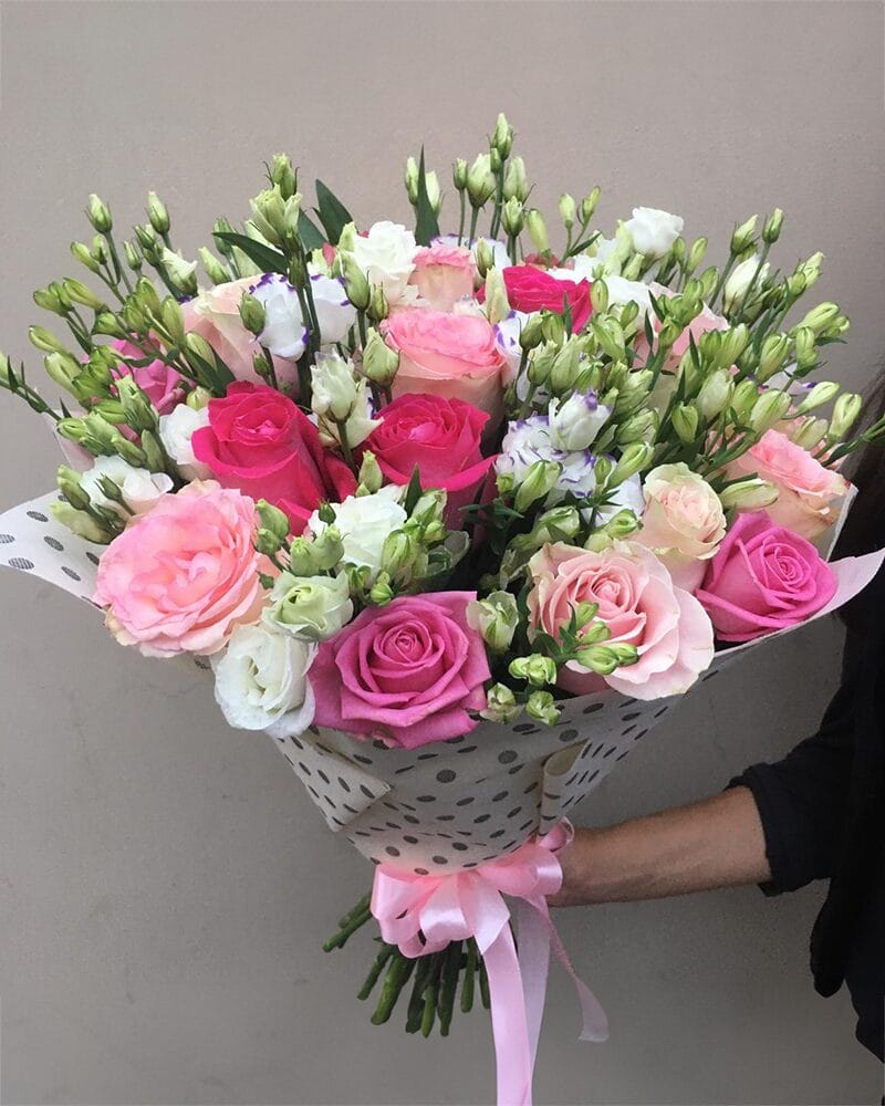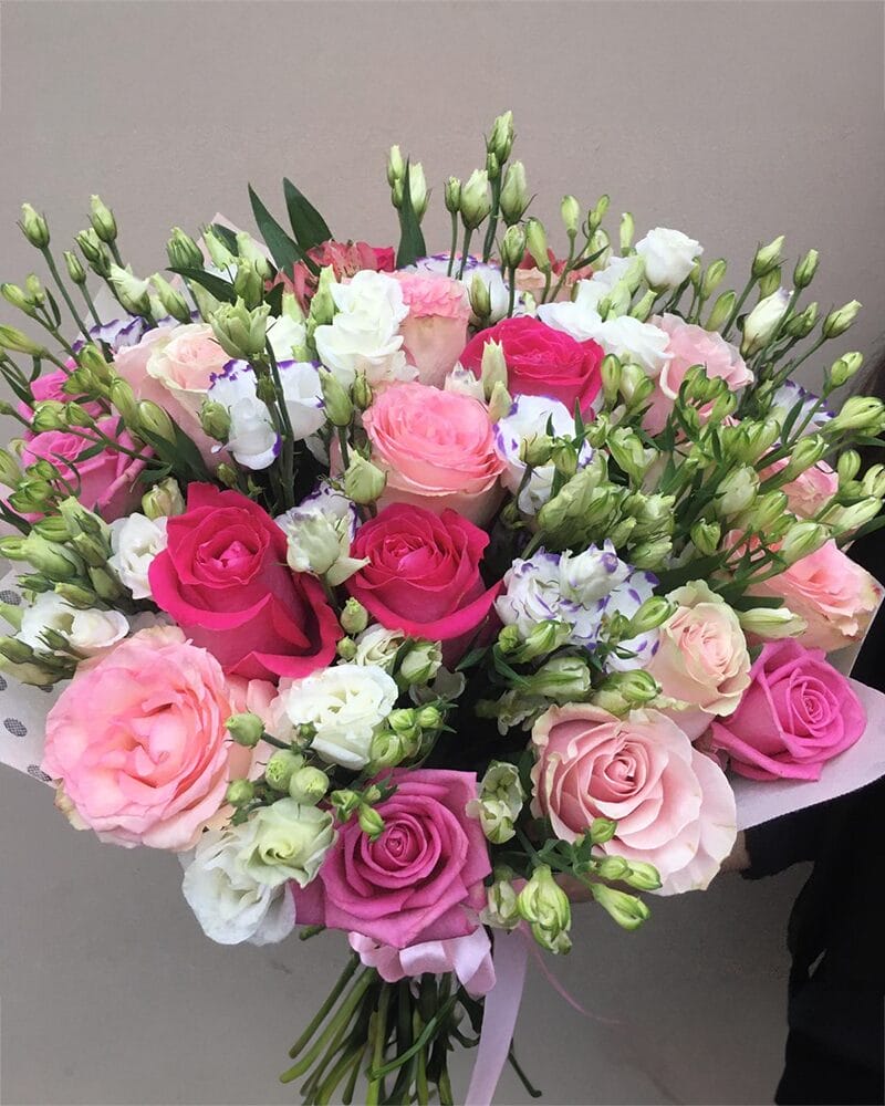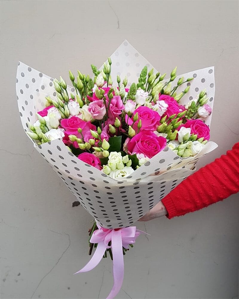 Rozā rožu un baltu lizanšu pušķisRozā rožu un baltu lizanšu pušķis