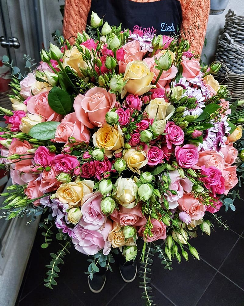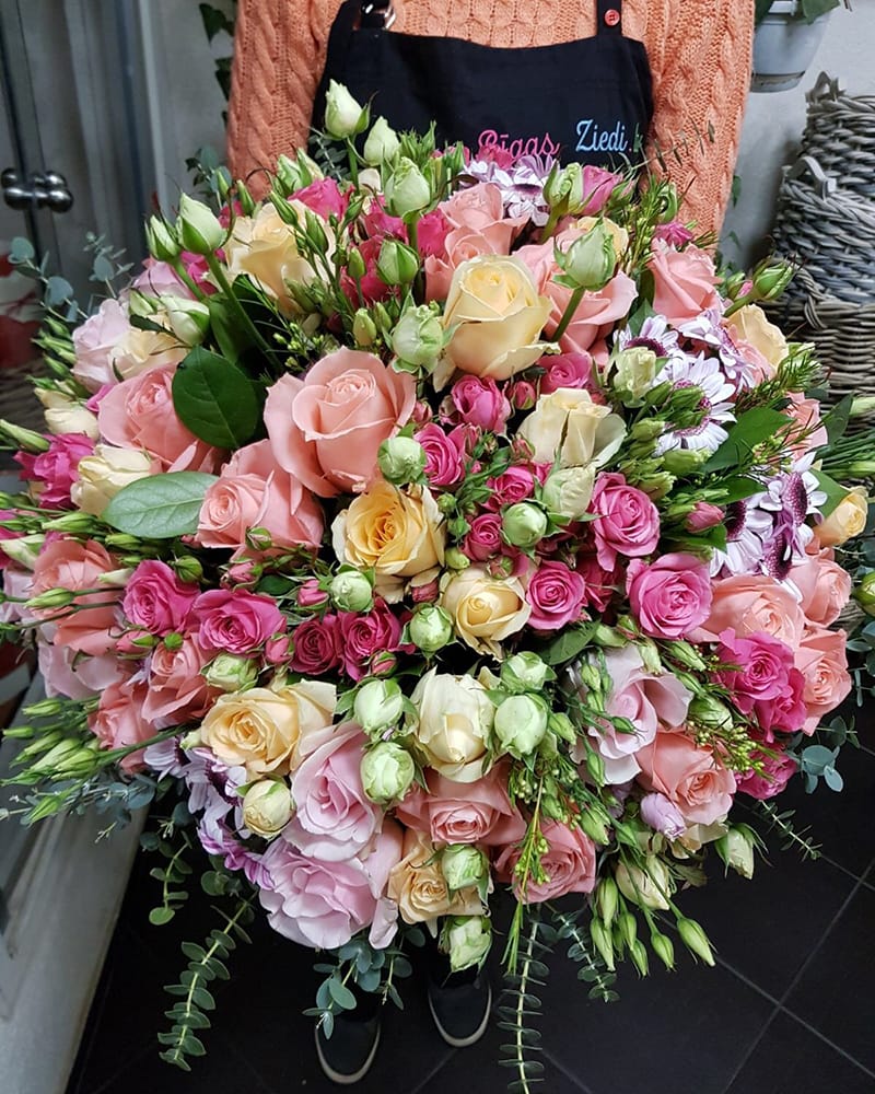 Ziedu pušķis sastāv no rozēm, krūmrozēm, krizantēmām, lizantēm, eikalipta un citiem zaļumiem