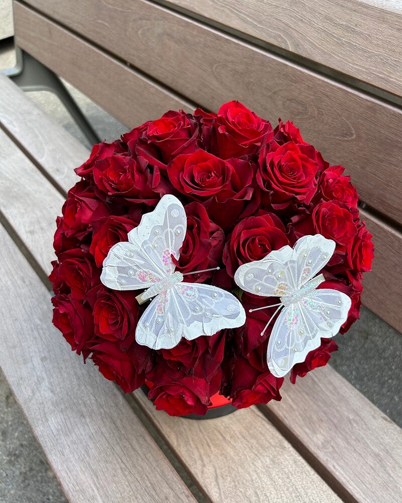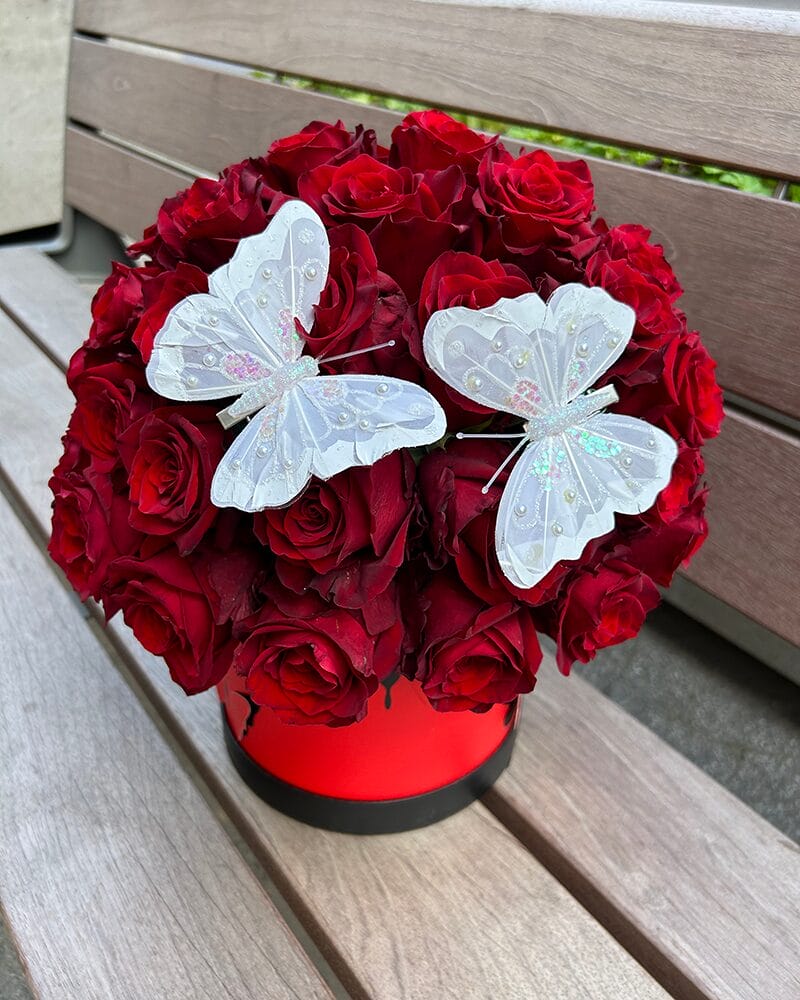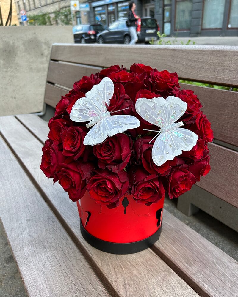Sākums » Ziedu katalogs » Rožu pušķi » Sarkanas rozes apaļā kastē ar tauriņiem