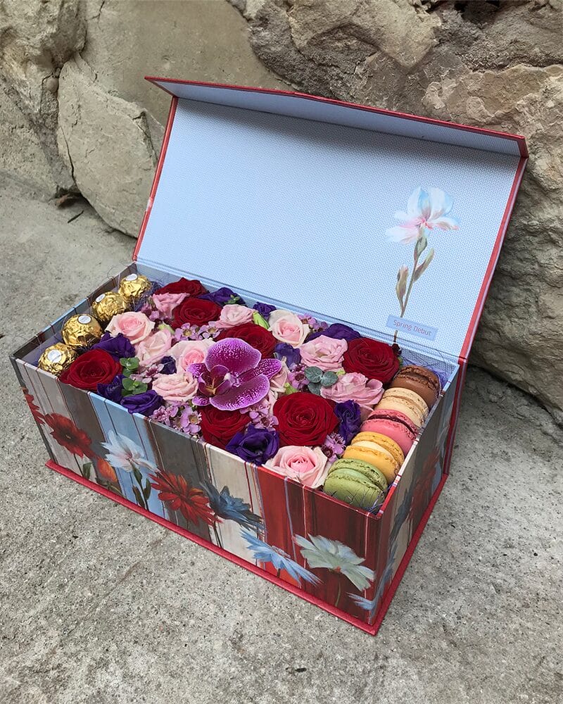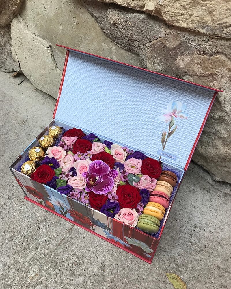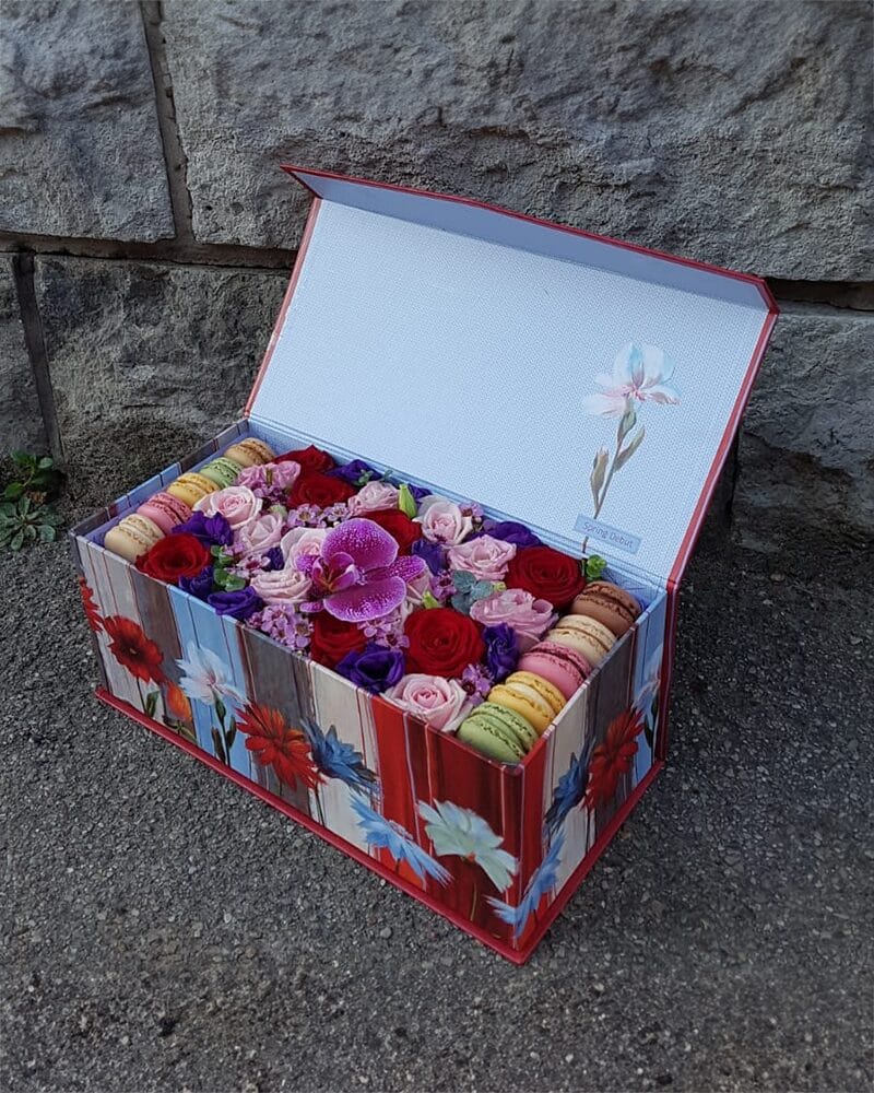 Sākums » Ziedu katalogs » Visi ziedi » Ziedu kastīte ar makarūniem