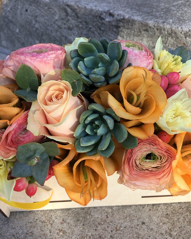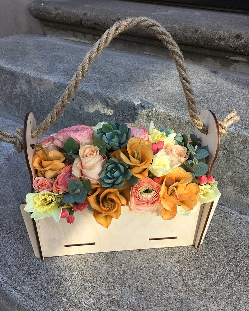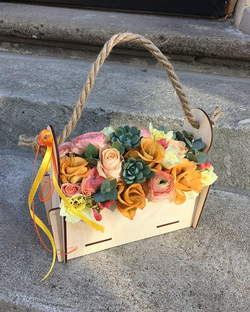 Ziedu kompozīcija koka kastē OranžaZiedu kompozīcija koka kastē Oranža