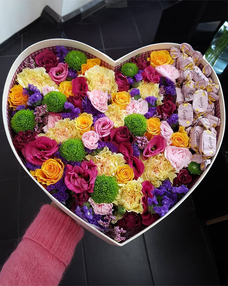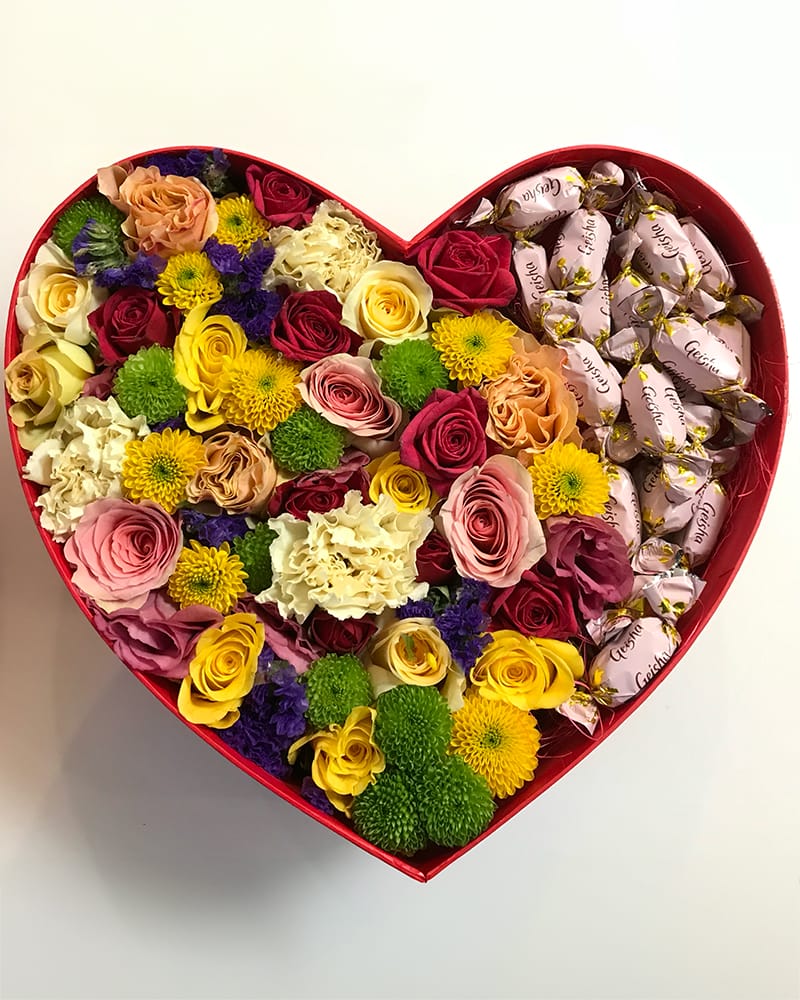 Ziedu kompozīcija sirds formas kastītē ar Geisha konfektēm