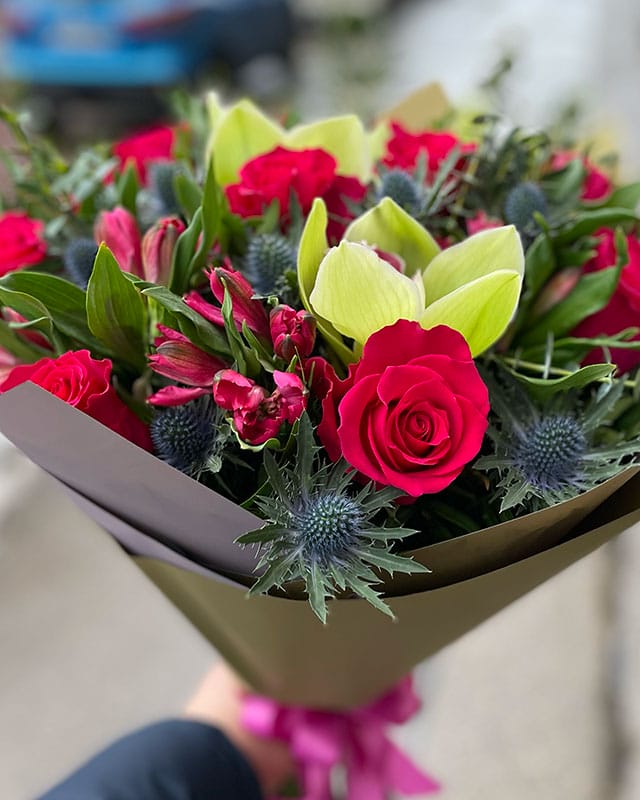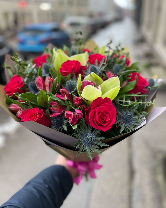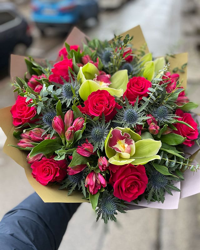 Kompozīcija sastāv no: 9 rozēm, 5 alstromērijām, 3 orhideju ziediem, 5 eryngium, 0.5 eikalipts, dekoratīvais iepakojums, bezmaksas apsveikuma kartīte.